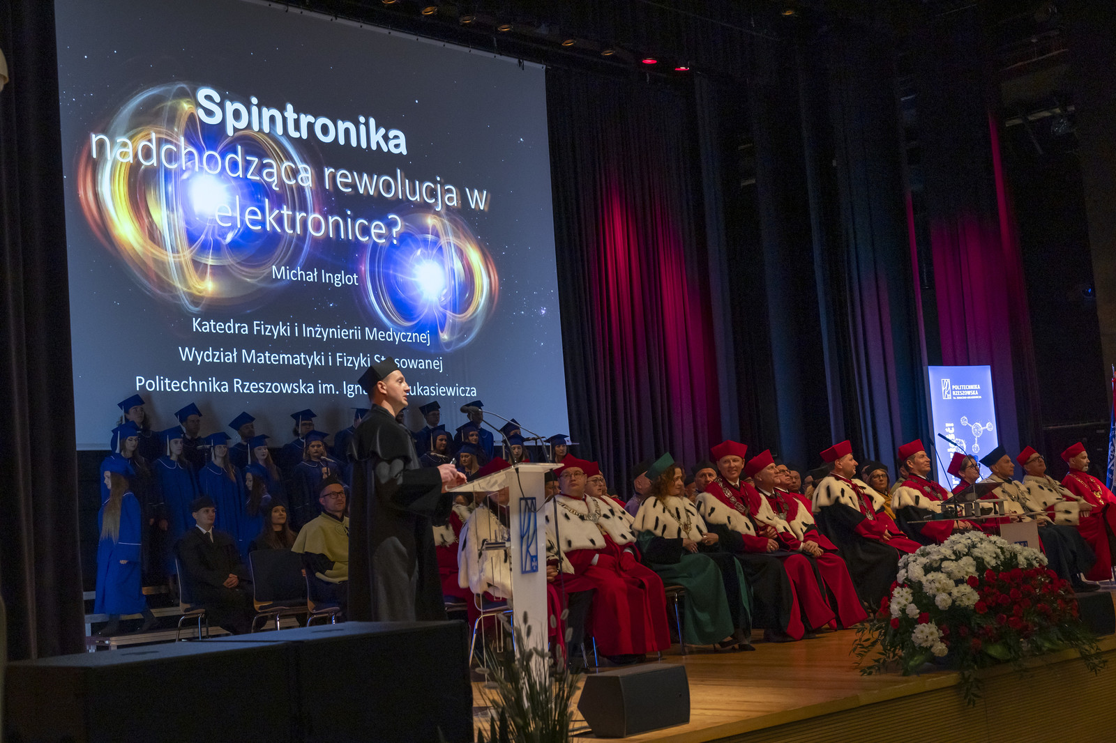 „Droga Młodzieży Akademicka, Szanowni Zebrani, zgodnie z tradycją ogłaszam rok akademicki 2025/2026 na Politechnice Rzeszowskiej za rozpoczęty” – powiedział JM Rektor, uderzając trzy razy berłem, a Chór Akademicki odśpiewał „Gaude Mater Polonia”. Wykład inauguracyjny „Spintronika nadchodząca rewolucja w elektronice?” wygłosił dr inż. Michał Inglot, prof. PRz.