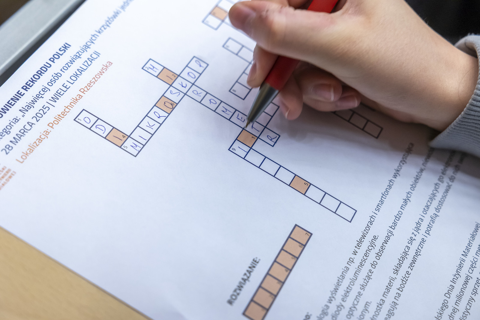Na Politechnice Rzeszowskiej organizacji, podobnie jak w roku ubiegłym, podjęli się pracownicy Katedry Nauki o Materiałach oraz Laboratorium Badań Materiałów dla Przemysłu Lotniczego Wydziału Budowy Maszyn i Lotnictwa. Uczestników przywitali dziekan Wydziału Budowy Maszyn i Lotnictwa dr hab. inż. Adam Marciniec, prof. PRz oraz przewodniczący Rady Dyscypliny Inżynieria Materiałowa dr hab. inż. Maciej Motyka, prof. PRz. Następnie dr inż. Tadeusz Kubaszek wygłosił ciekawy wykład pt. „Czy materiały mogą mieć supermoce?”. Program obejmował także próbę ustanowienia rekordu Polski w kategorii „Najwięcej osób rozwiązujących krzyżówki jednocześnie (wiele lokalizacji)” – dla uczczenia 100-lecia ukazania się pierwszej polskiej krzyżówki w „Kurierze Warszawskim".